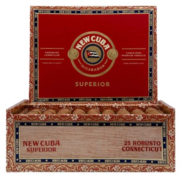 Elaborately packaged in boxes of 25, New Cuba Superior is wrapped in a Connecticut Cover Leaf and made entirely of long filler Leaf.